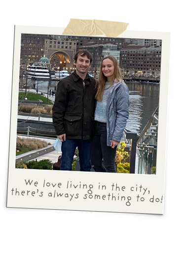 We count ourselves lucky to live in a special neighborhood in downtown Boston. We have been married for four years and live in a two-bedroom apartment with our sweet 3-year-old dog, Mookie, and our 9-year-old calico cat, Ellie. Mookie loves to walk around town, stopping to visit her shopkeeper friends and playing in the many beautiful parks nearby.